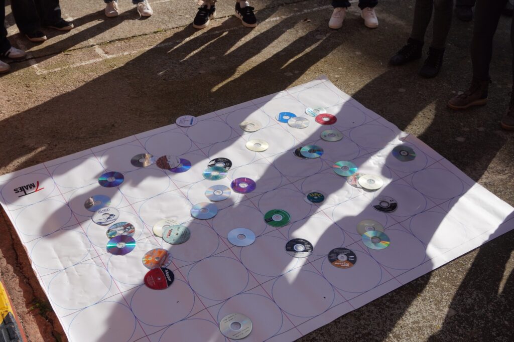 A l’hora del descans, vam aprofitar per fer l’experiment empíric llançant més de 200 CD’s dins d’una lona, recollint les dades per després ja a classe, meravellar-nos de trobar aproximació prou decent del nombre pi.